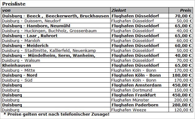 Flughafentransfer: Bei Vorbestellungen und Anfragen Mobil: 0163 2947828* *(nur von 8:00 Uhr bis 22:00 Uhr) WhatsApp Service Nutzen Sie unseren neuen WhatsApp Service und bestellen Sie Ihr Taxi ab sofort online. Einfach unsere Nummer 0163 2947828 einspeichern und WhatsApp aktualisieren. Los gehts! Unser Transferangebot zum Flughafen Ihrer Wahl ab Duisburg: Sie haben vor in Urlaub zu fliegen, oder haben geschäftlich in Duisburg zu tun? Wir bringen Sie pünktlich und preiswert zum Flughafen! Und holen wir Sie selbstverständlich gerne auch vom Flughafen ab! Teilen uns Ihre Flugnummer, Ankunftszeit u. Handynummer mit und wir erwarten Sie problemlos am Flughafengebäude. Ab 5 bis 6 Personen erheben wir 5,10 Euro Großraumtaxizuschlag. Wir akzeptieren auch Kreditkarten